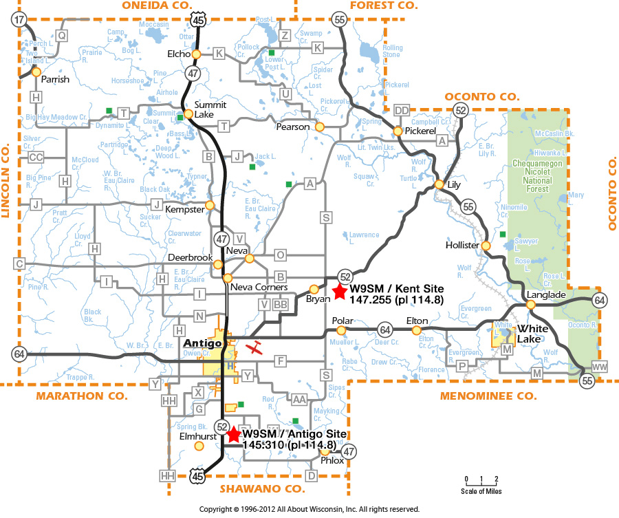 The WVRA hosts two 2m FM repeaters near Antigo, WI. One south of town and another north-east of town.